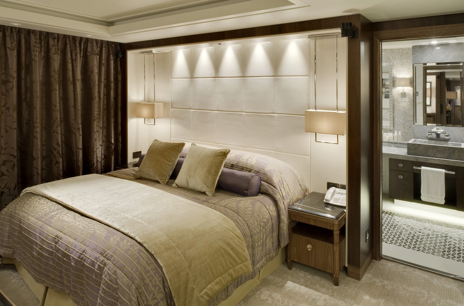 And dining experiences are no less glamorously appointed, with table linens by Frette as well as Garnier Thiebaut, Schott-Zwiesel crystal, Villeroy & Boch and Wedgewood china, Royal Doulton dishware, Sheffield and Sambonet flatware as you sink your feet into Axminster wool carpets beneath your table.